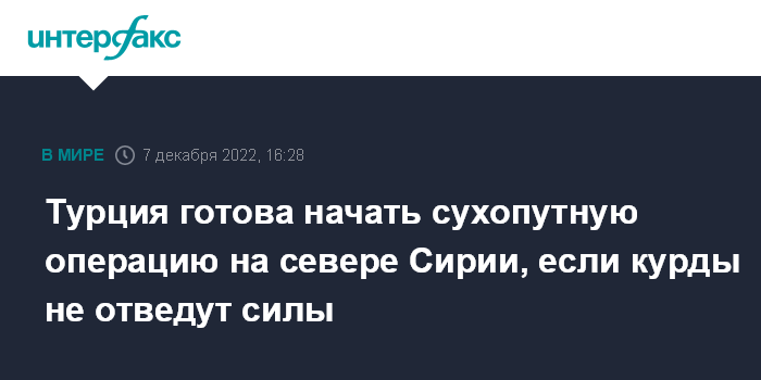 Москва. 7 декабря. INTERFAX.RU - Власти Турции намерены начать сухопутную операцию против курдских формирований, если те не отведут войска за ближайшие две недели, сообщает в среду "Аль-Джазира" со ссылкой на турецкие источники.