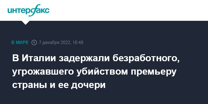 Москва. 7 декабря. INTERFAX.RU - Итальянские правоохранительные органы задержали 27-летнего безработного сицилийца, который распространял в твиттере сообщения с угрозами убийства в отношении председателя Совета министров Италии Джорджи Мелони и ее шестилетней дочери, сообщает в среду итальянский телеканал Rai News.
