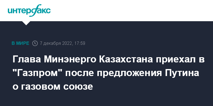 Москва. 7 декабря. INTERFAX.RU - Министр энергетики Казахстана провел переговоры в "Газпроме" спустя неделю после сообщения об инициативе президента России Владимира Путина о трехстороннем газовом союзе России, Казахстана и Узбекистана.