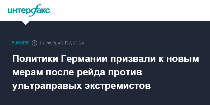 Москва. 7 декабря. INTERFAX.RU - Представители ведущих политических партий Германии на фоне масштабных рейдов против ультраправых экстремистов движения "Рейхсбюргеры" заявляют о необходимости продолжать бороться с угрозой государственному строю Германии.
