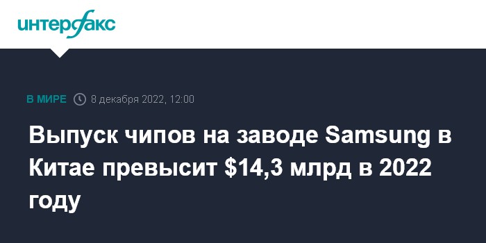 Москва. 8 декабря. INTERFAX.RU - Объем производства чипов на заводе Samsung в городе Сиань китайской провинции Шэньси по итогам текущего года, как ожидается, превысит 100 млрд юаней ($14,3 млрд), несмотря на антиковидные ограничения, сообщает агентство "Синьхуа".