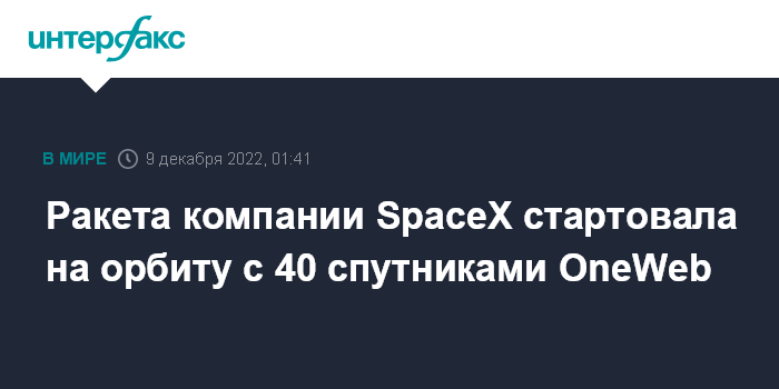 Москва. 9 декабря. INTERFAX.RU - Ракета Falcon 9 в пятницу по московскому времени стартовала на орбиту с 40 британскими спутниками связи OneWeb, сообщила американская компания-разработчик носителя SpaceX.