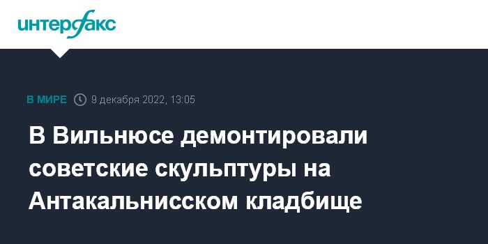 Москва. 9 декабря. INTERFAX.RU - В Вильнюсе на Антакальнисском кладбище завершен демонтаж скульптур советских воинов, они вывезены с территории кладбища.