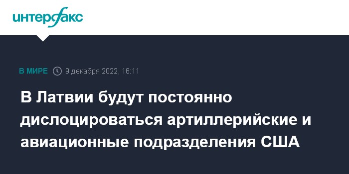 Москва. 9 декабря. INTERFAX.RU - С целью усиления военного присутствия в странах Балтии в ближайшие годы в Латвии будут постоянно дислоцироваться артиллерийские и авиационные подразделения США, сообщили в латвийском министерстве обороны.