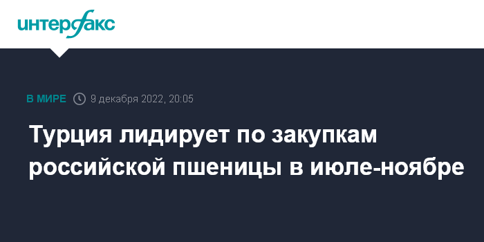 Москва. 9 декабря. INTERFAX.RU - Турция стала лидером по импорту российской пшеницы в июле-ноябре этого года, закупив ее 3,6 млн тонн. Об этом сообщил руководитель аналитического центра АО "Русагротранс" Игорь Павенский на бизнес-конференции "Агрохолдинги-2022" (организована журналом "Агроинвестор") в пятницу в Москве.