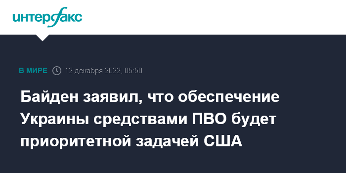 Москва. 12 декабря. INTERFAX.RU - Президент США Джо Байден назвал обеспечение Украины средствами противовоздушной обороны приоритетной задачей Соединенных Штатов.