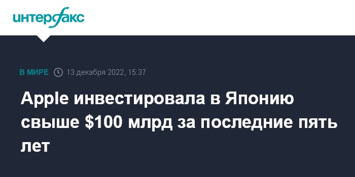 Москва. 13 декабря. INTERFAX.RU - Американская Apple Inc инвестировала свыше $100 млрд в сеть из почти 1 тысячи своих поставщиков в Японии за последние пять лет.
