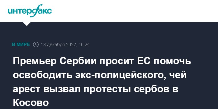 Москва. 13 декабря. INTERFAX.RU - Глава правительства Сербии Ана Брнабич во вторник обратилась к ЕС за содействием в освобождении бывшего сотрудника косовской полиции серба Деяна Пантича, задержание которого вызвало мощные протесты в сербских общинах Косово.