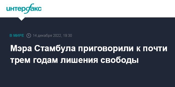 Москва. 14 декабря. INTERFAX.RU - Мэра Стамбула Экрема Имамоглу приговорили к двум годам и семи месяцам лишения свободы, это может привести к его отстранению от должности городского главы, пишет в среду агентство Associated Press.