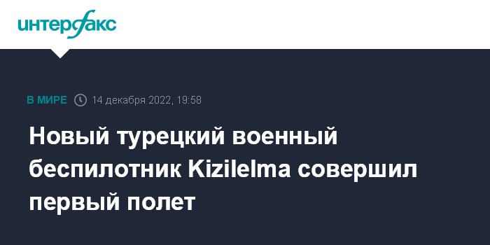 Москва. 14 декабря. INTERFAX.RU - Военный беспилотный летательный аппарат Kizilelma ("Красное яблоко"), созданный турецкой компанией Baykar, совершил свой первый полет, сообщило в среду агентство "Анадолу".