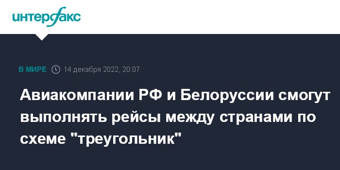 Москва. 14 декабря. INTERFAX.RU - Авиакомпании РФ и Белоруссии смогут выполнять пассажирские рейсы между двумя странами по схеме "треугольник". К такой договоренности пришли профильные ведомства государств, следует из материалов на сайте Росавиации.