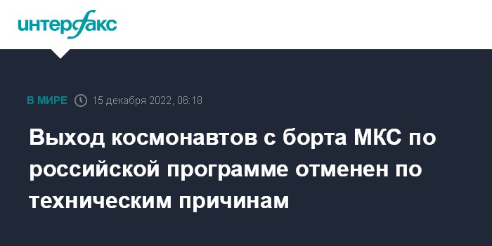 Москва. 15 декабря. INTERFAX.RU - Выход в открытый космос с борта Международной космической станции (МКС) российских космонавтов Сергея Прокопьева и Дмитрия Петелина отменён по техническим причинам, сказали в пресс-службе "Роскосмоса".