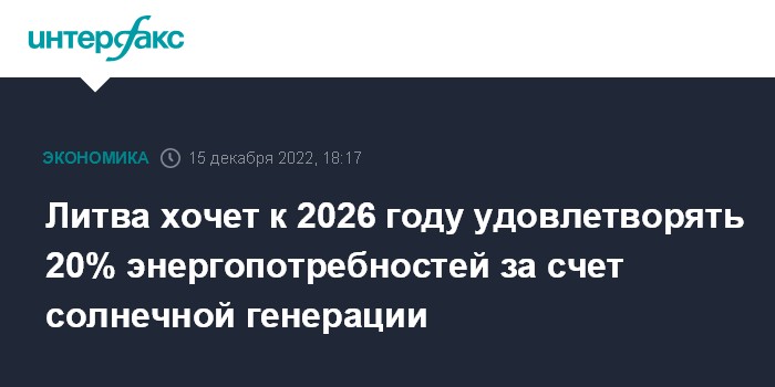 В итоге суммарная установленная мощность солнечных электростанций позволит к 2026 году удовлетворить около 20% потребности Литвы в электроэнергии против 3% в настоящее время, сказал он журналистам.