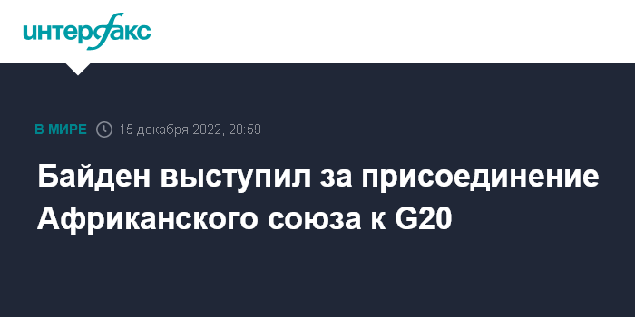 Москва. 15 декабря. INTERFAX.RU - Президент США Джо Байден призвал Африканский союз присоединиться к G20 в качестве постоянного члена. Он сделал это заявление в Вашингтоне на саммите лидеров стран Африки в США, его слова вызвали бурные аплодисменты.