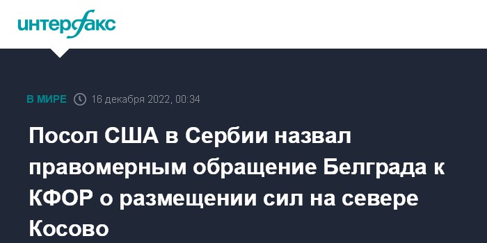 Посол США в Сербии назвал правомерным обращение Белграда к КФОР о размещении сил на севере Косово