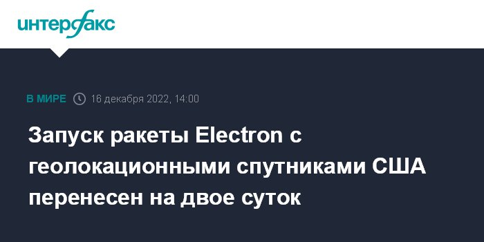 Москва. 16 декабря. INTERFAX.RU - Запуск ракеты Electron с тремя американскими спутниками HawkEye, предназначенными для определения местоположения источников радиосигналов на поверхности Земли, перенесен на двое суток, сообщила компания-разработчик носителя Rocket Lab.