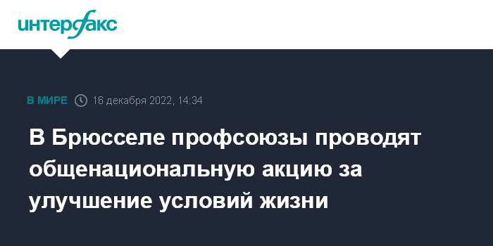 Москва. 16 декабря. INTERFAX.RU - В Брюсселе по призыву объединения профсоюзов проходит общенациональная демонстрация против роста цен на энергоснабжение, заморозки зарплат, ожидаемой отмены ряда дополнительных выплат и за повышение покупательской способности, передает RTBF.