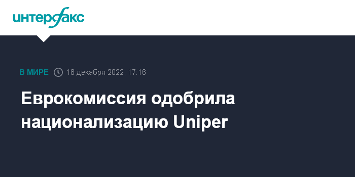 Москва. 16 декабря. INTERFAX.RU - Европейская комиссия, выполняющая функции главного антимонопольного регулятора Евросоюза, одобрила приобретение энергетической компании Uniper SE правительством Германии в лице министерства финансов ФРГ, говорится в сообщении комиссии.