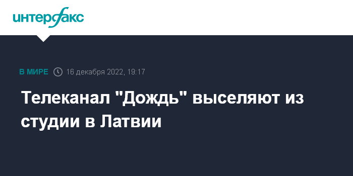 Москва. 16 декабря. INTERFAX.RU - В Латвии медиагруппа "TV3 Group", которая ранее сдавала в аренду помещения российскому телеканалу "Дождь" (признан в РФ СМИ-иноагентом), расторгнет договор с лишенным лицензии каналом. Об этом сообщил специалист по связям с общественностью "TV3 Group" Карлис Позняков.