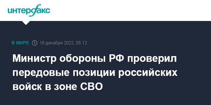 Москва. 18 декабря. INTERFAX.RU - Министр обороны России Сергей Шойгу побывал на передовых позициях российской армии в зоне специальной военной операции (СВО) на Украине, совершил облет районов дислокации войск, сообщили в военном ведомстве РФ в воскресенье.
