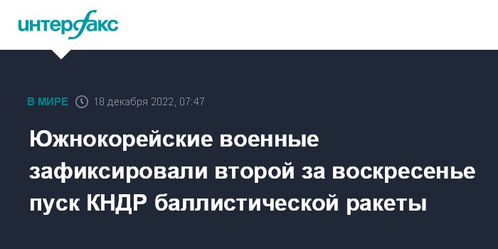 Москва. 18 декабря. INTERFAX.RU - Объединенный комитет начальников штабов (ОКНШ) вооруженных сил Южной Кореи зафиксировал второй за воскресенье пуск Северной Кореей баллистической ракеты, сообщило агентство "Ренхап".