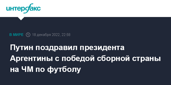 Москва. 18 декабря. INTERFAX.RU - Президент России Владимир Путин поздравил в воскресенье аргентинского лидера Альберто Фернандеса с победой аргентинской сборной на чемпионате мира по футболу в Катаре.