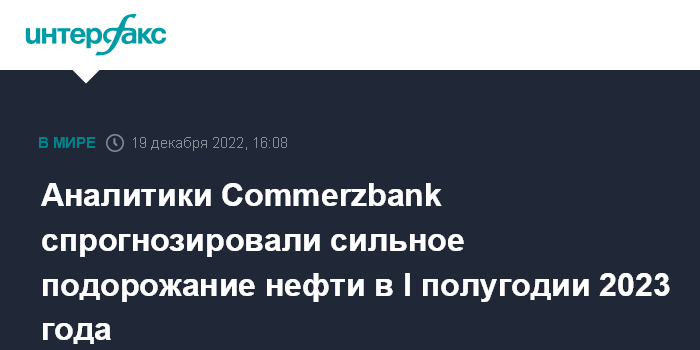 Москва. 19 декабря. INTERFAX.RU - Цены на нефть вновь сильно вырастут в первом полугодии 2023 года на фоне значительного усиления напряженности на нефтяных рынках, говорится в сообщении Commerzbank. Причем решающим фактором станет эмбарго Европейского союза на российскую нефть.