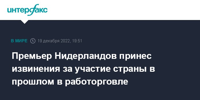 Москва. 19 декабря. INTERFAX.RU - Премьер Нидерландов Марк Рютте от лица правительства извинился в понедельник за историческую роль страны в распространении работорговли, сообщает в понедельник Associated Press (AP).