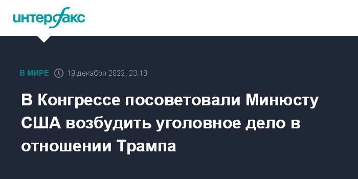 Москва. 19 декабря. INTERFAX.RU - Спецкомитет Палаты представителей Конгресса США, расследующий обстоятельства штурма Капитолия 6 января 2021 года, проголосовал за то, чтобы направить в Минюст запрос на возбуждение уголовного дела в отношении экс-президента США Дональда Трампа, сообщает Associated Press.