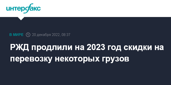 Москва. 20 декабря. INTERFAX.RU - Правление ОАО "РЖД" продлило на следующий год действующие скидки на перевозку ряда грузов, сообщила компания.