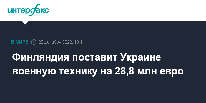 Москва. 20 декабря. INTERFAX.RU - Финляндия направит Украине военную технику стоимостью в 28,8 млн евро, сообщило финское Министерство обороны.