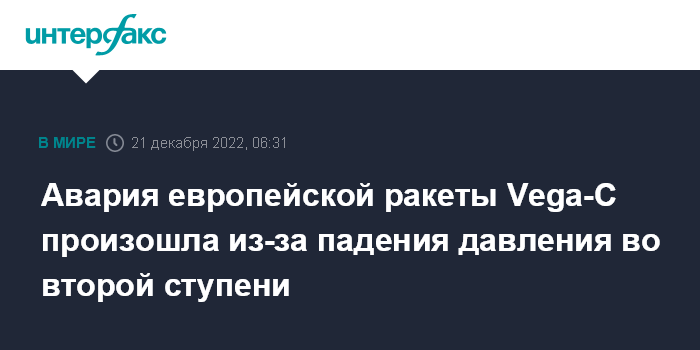 Москва. 21 декабря. INTERFAX.RU - Неудачный запуск в среду европейской ракеты Vega-C с двумя спутниками дистанционного зондирования Земли Pleiades Neo 5 и 6 гражданского и военного назначения был вызван проблемой в работе ее второй ступени, сообщил глава компании-оператора Arianespace Стефан Исраэль.