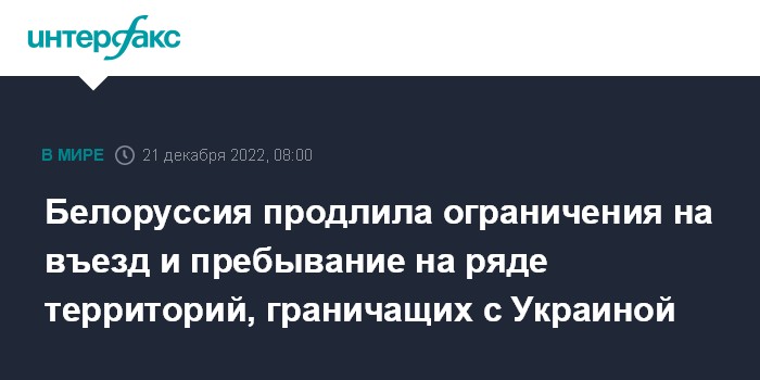 Москва. 21 декабря. INTERFAX.RU - Белоруссия продлила ограничения на въезд и пребывание на некоторых территориях, граничащих с Украиной, соответствующее постановление правительства республики опубликовано в среду на Национальном правовом интернет-портале.