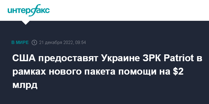 Отмечается, что в рамках этого нового пакета помощи США предоставят Украине зенитно-ракетные комплексы (ЗРК) Patriot, а также проведут обучение украинских военнослужащих для использования этой системы.