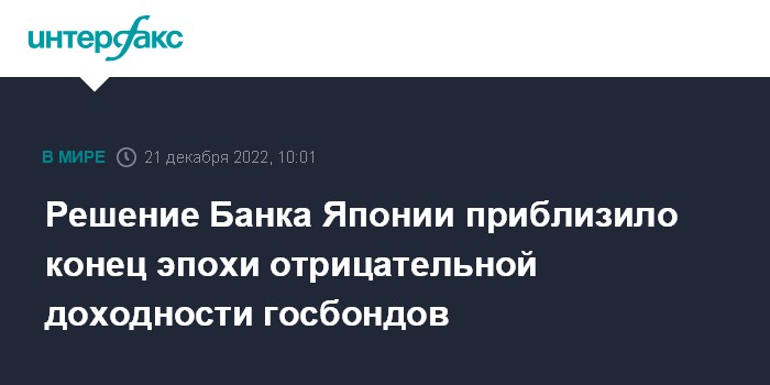 Москва. 21 декабря. INTERFAX.RU - Решение Банка Японии расширить допустимый диапазон колебаний доходности десятилетних государственных облигаций, принятое накануне, привело к росту доходности для всего спектра госбумаг, пишет агентство Bloomberg.
