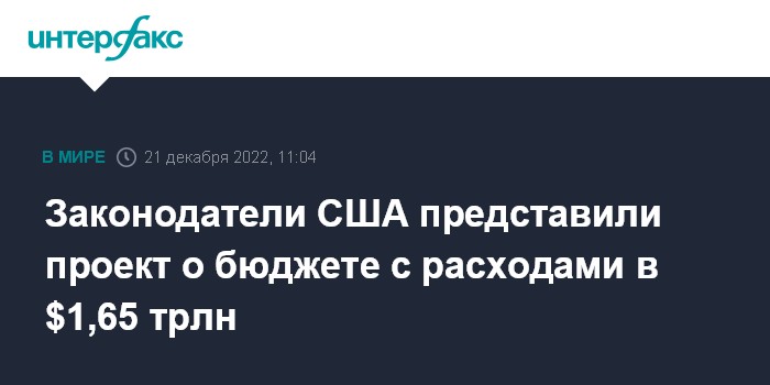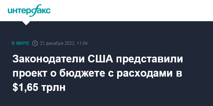 Москва. 21 декабря. INTERFAX.RU - Американские законодатели, участвовавшие в двухпартийных переговорах, представили законопроект о бюджете на следующий год, предусматривающий расходы на общую сумму $1,65 трлн.