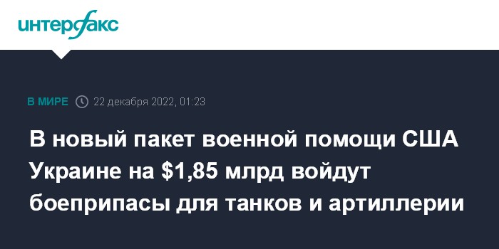 Москва. 22 декабря. INTERFAX.RU - Президент США Джо Байден объявил, что новый транш военной помощи Украине на сумму в $1,85 млрд предусматривает контракты на поставки боеприпасов для украинских артиллерии и танков.