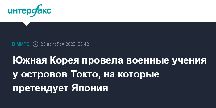 Москва. 23 декабря. INTERFAX.RU - Южная Корея на этой неделе провела регулярные военные учения на островах Токто (японское название - Такэсима), права на которые заявляет Токио, сообщает "Ренхап" со ссылкой на осведомленный источник.