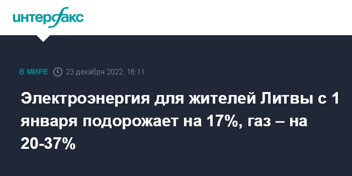 Москва. 23 декабря. INTERFAX.RU - Государственный совет Литвы по регулированию энергетики в пятницу утвердил тарифы на электроэнергию и газ для общественных потребителей на первую половину 2023 года.