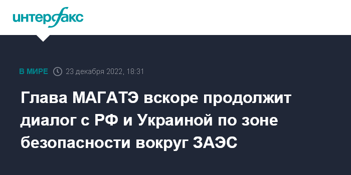 Москва. 23 декабря. INTERFAX.RU - Гендиректор МАГАТЭ Рафаэль Гросси в ближайшее время продолжит консультации с представителями России и Украины по установлению зоны безопасности вокруг Запорожской АЭС (ЗАЭС).