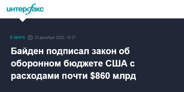 "Сегодня я подписал (...) закон о бюджетных ассигнованиях на национальную оборону на 2023 финансовый год. Закон дает разрешение использовать ассигнования министерству обороны, программам Минэнерго по нацбезопасности, Госдепартаменту, министерству внутренней безопасности и разведывательному сообществу", - приводятся слова президента в заявлении Белого дома.