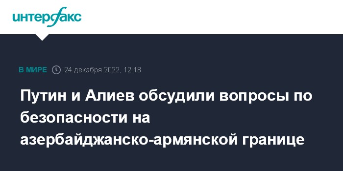 Москва. 24 декабря. INTERFAX.RU - Президент России Владимир Путин обсудил по телефону с президентом Азербайджана Ильхамом Алиевым ситуацию с обеспечением безопасности на азербайджанско-армянской границе.