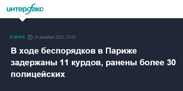 Как сообщалось, беспорядки, в которых приняли участие сотни человек, прошли близ площади Республики в субботу. Причиной демонстрации стала произошедшая накануне стрельба во французской столице: 69-летний мужчина убил трех курдов и ранил еще нескольких. Вскоре после этого, вечером 23 декабря, близ места происшествия, произошли столкновения между курдами и полицейскими.