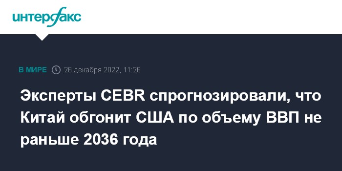 Москва. 26 декабря. INTERFAX.RU - Объем экономики Китая не сможет превысить ВВП США как минимум до 2036 года, прогнозирует британский Центр экономических и деловых исследований (Centre for Economics & Business Research, CEBR).