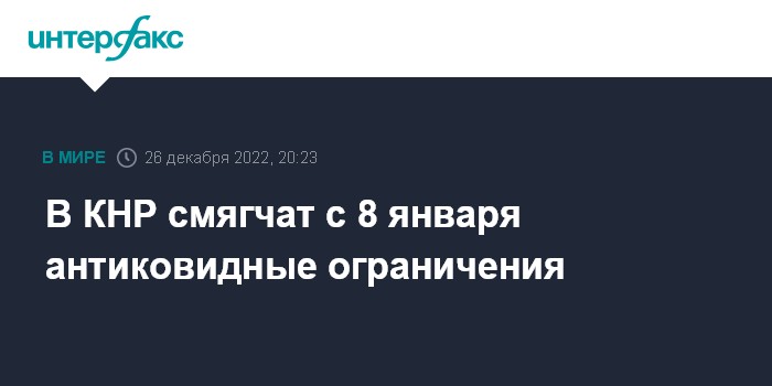 В рамках этого решения с 8 января 2023 года прибывающим в Китай не нужно будет отправляться в обязательном порядке на карантин: эта мера останется в силе только для тех, у кого выявлен COVID-19. При этом для въезда на территорию КНР будут требовать отрицательный тест на коронавирус, отмечает Bloomberg.