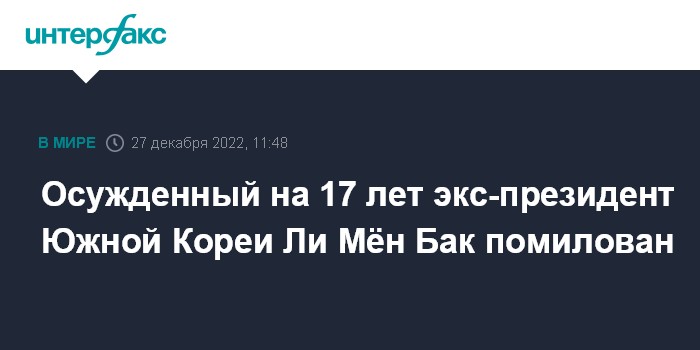 Ли Мён Бак отбывал 17-летний срок в тюрьме за коррупцию, помилование сократило ему срок лишения свободы на 15 лет и отменило обязанность довыплатить остаток штрафов на общую сумму 8,2 млрд вон ($6,48 млн), напоминает "Ренхап". Ожидалось, экс-президента помилуют в августе 2022 года, но в последнюю минуту его исключили из списка из политических соображений, связанных с низким рейтингом одобрения Юн Сок Ёля в то время.