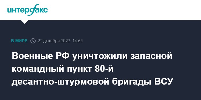 Москва. 27 декабря. INTERFAX.RU - Российские военные заявили о поражении в районе Краматорска в ДНР запасного командного пункта 80-й десантно-штурмовой бригады армии Украины.