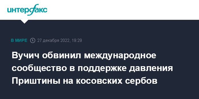 Москва. 27 декабря. INTERFAX.RU - Президент Сербии Александр Вучич обвинил международное сообщество в поддержке политики Приштины, подразумевающей давление на косовских сербов, передает во вторник агентство EFE.
