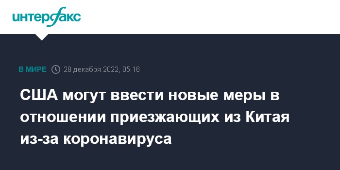 Москва. 28 декабря. INTERFAX.RU - Власти США рассматривают возможность принятия новых мер предосторожности в отношении приезжающих из Китая в целях борьбы с распространением COVID-19, сообщает Bloomberg.