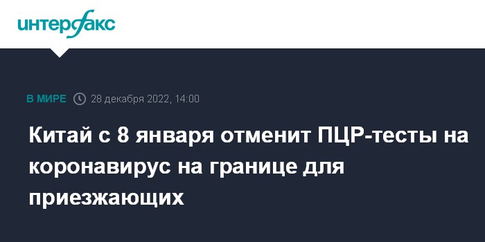 Москва. 28 декабря. INTERFAX.RU - Китайские власти с 8 января более не будут требовать от лиц, въезжающих в страну, сдавать при пересечении границы ПЦР-тесты на COVID-19. Об этом сообщает в среду CGTN со ссылкой на Главное таможенное управление КНР.